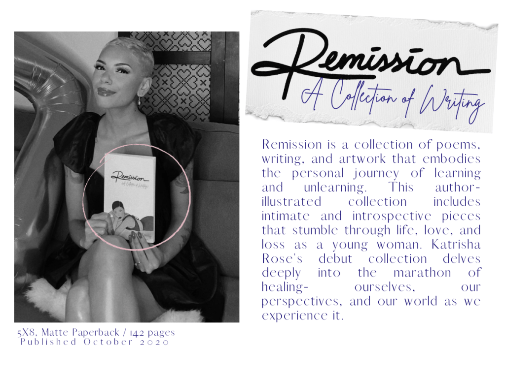 To say I’m proud of Remission would be an understatement. In the last four years since publishing it, I have grown and evolved considerably, notably in my faith and my walk with God. Even now, seeming so far removed from the experiences that inspired the pieces Remission contains, I can open it today and immediately fall back into a moment with every word. Within Remission are some of the most intimate thoughts and feelings I ever uttered outside of myself, and it still is hard to believe I published this work for the world to see. It is truly a piece of my heart and it represents a myriad of personal experiences that intimately make me who I am today. My feelings toward this work have remained deeply sentimental.